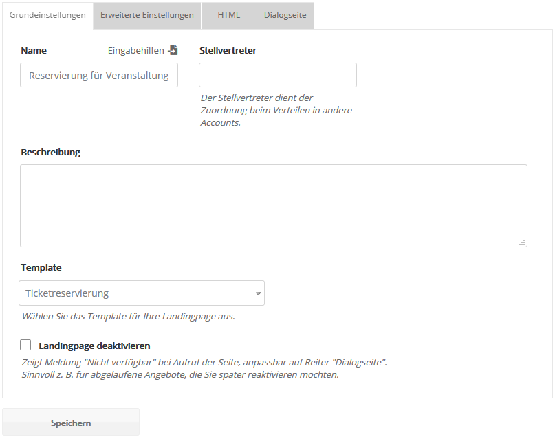 Um eine neue Landingpage anzulegen, klicken Sie oben rechts auf 'Neue Landingpage' und geben anschließend den gewünschten Namen Ihrer Landingpage ein. GrundeinstellungenHier hinterlegen Sie den Namen und die (optionale) Beschreibung Ihrer Landingpage. Außerdem können Sie ein Landingpage-Template wählen, um Ihre Landingpage ohne HTML-Kenntnisse zu befüllen.