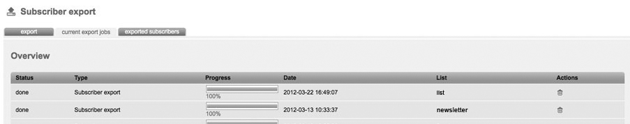 In the tab 'Exported Subscribers’, you can find the export file which you can save on your computer by clicking the button 'Download’. In the tab 'Exported Subscribers’, you find a detailed view of the exported data records. In order to download the export file you finally have to click on 'Download’.