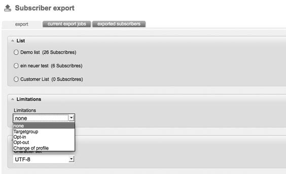 Subscribers lists can be exported from GMLU-Newsletter as CSV – files. An advantage, for example, is that you can back up the address lists in this way. In the tab 'Export’, you can make choices of the lists that have to be exported. Per export only one subscriber list can be chosen. If you only want to export certain data records, you can decide on 'Limitations’. |