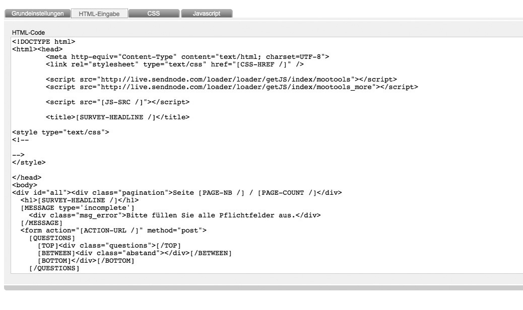 Insert your entire html source code. By creating a new template, GMLU-Newsletter generates a sample html source code with all important survey-placeholders automatically in this tab.