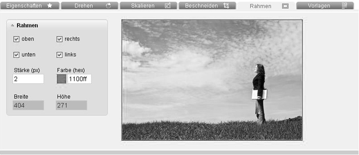 Rotate: This tab includes functions to rotate or reflect your image. The two buttons in the top rotate the image 90 degrees in each case either the right or left. Decide if your image should be cutted automatically or if a framework should be created, which can be colored.