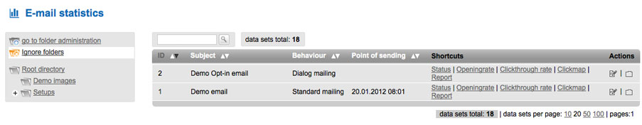 Here you find the statistics of all sent mails. For easier access GMLU-Newsletter already includes a demo-mail you can view. |