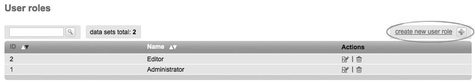 Click 'create new user role' to add a new user and determine his rights. Enter an 'user role' name in tab 'basic settings'. Choose your favorite rights in different tabs of 'permission'. Depending on the choosen right you have the possibility to 'create', 'activate', 'use', 'edit', 'delete', … Don't forget to save your settings.