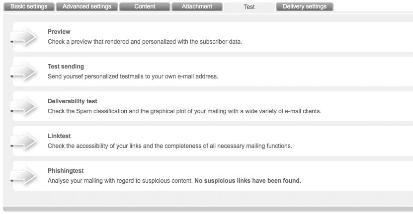 Having finished your newsletter, GMLU-Newsletter offers you numerous testing possibilities. This helps you to optimize your mailing and achieve maximum success before actual dispatch. You can get to the testing functions by choosing the tab 'Test' in the menu in which you edit your mailing. Following tests are available: |