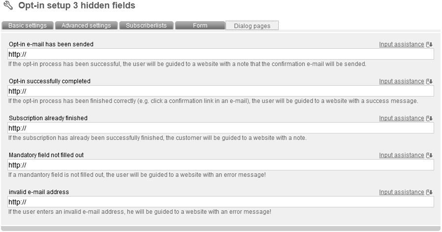 Now enter a name and an optional description for your optin setup. Then choose the 'mode' (important). The following modes are supported by 'GMLU-Newsletter': Double Opt-in with confirmation e-mail (recommended as the only legally secure login variant): Interested party visits a website with an optin setup form. He enters his data into the form. He gots an e-mail with content like this: „Thank you for your optin. Please confirm the registration confirmation link to complete your registration.“ He clicks the link. Registration is completed. He gots a „welcoming“ e-mail. You can integrate information about your company and a certain design as well. Double Opt-in: Like described before, but without sending of a „welcoming“ e-mail. Confirmed Opt-In: Nach Anmeldung auf der Webseite wird sofort eine automatische Begrüßungsnachricht versendet. Single Opt-in: No e-mails will be send. There just will be a message in your browser, that registration was successfull. According to the mode you've choosed, you have to adapt different sub-options. In Tab 'advanced settings' you can deposit your e-mail address in field 'e-mail forwarding', to be informed about new subscribers. In field 'mailing for later delivery' you can determine your last sended newsletter. All new subscribers will receive your last mailing and don't have to wait for another one. To protect your optin-form against abuse, activate the invisible captcha . Captchas are often used to check if petitions are produced by a machine (robot, short: bot) or a real person. Bots are often used abusive to generate masses of subscriptions. Choose your favorite subscriberfields, which should be filled in in next tab 'Form'. After clicking 'Add subscriberfield' a pop up appears, where you can select and add subscriberfields to your optin-form. Furthermore you can add one or more subscriberlists as option(s) in a ceckbox through the button 'add subscriberlist'. Click 'sort formfields' to edit order of your fields. Click 'test form' to check your form by a preview of your optin-form. Next tab: 'Dialog pages':
