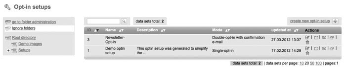 Through 'Setups' and 'Optin Setup' you can create forms, which can be included into your website. So interested parties can login automatically on your website for your subscriberlist(s). Please note: Requirement for a successfull 'optin setup' is to create an e-mail with type 'dialog mailing' for registration confirmation and welcoming, which got the status 'activated'. Otherwise those mailings will be lacking in the shortlist of mailings which you can choose for your optin setup. For an esier start GMLU-Newsletter gots a „Demo optin setup“ for you. Created optin setups can be 'opend' afterwards for editing, 'moving' to another folder or 'deleting'. If you have moved an optin setup into another folder, click 'open folder' to get into. Create new Optin setup |