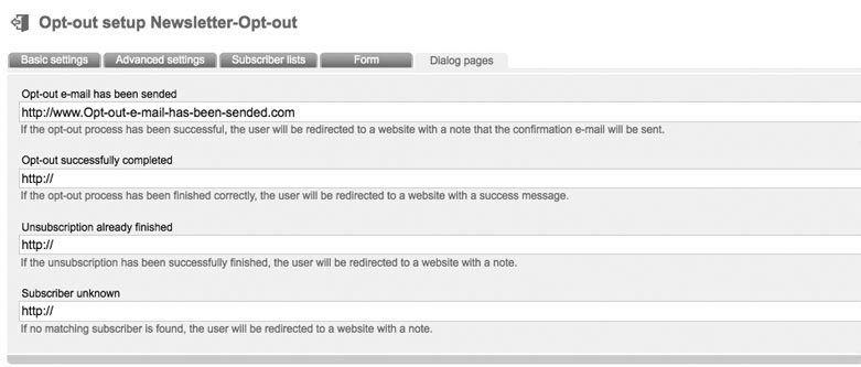 Enter a name and an optional description. Choose the 'mode' (important). The following modes are supported by 'GMLU-Newsletter': Double-optout with confirmation e-mail: after unsubscribe from your website or your newsletter a confirmation email will be send automatically. Optout will be activated after clicking the confirmation link in this email. After successful unsubscription the former subscriber will get a last email („You unsubscribed successfully of our newsletter.“) Double Optout: Like described before, but without sending of a „successful unsubscription“ e-mail Confirmed Opt-Out (recommended): After unsubsubscription on your website or in your newsletter a „successful unsubscription“ email will be sended immediately. Single Optout: No e-mails will be send. There just will be a message in your browser, that optout was successfull. In Tab 'advanced settings' you can deposit your e-mail address in field 'e-mail forwarding', to be informed about unsubscriptions. Tab 'subscriberlists': Choose your favorite subscriberlist(s), where all unsubscriptions should be logged out. Select the subscriberfields, which should be filled out by your subscribers in tab 'Form'. After clicking 'create form fields' a popup appears, where you can choose and add subscriber fields to your form. Click 'sort formular fields' to arrange your fields. Click 'test form' to open a new tab in your browser with a preview of your form. Source Code of your website is genereated by 'GMLU-Newsletter' by clicking 'Formular soruce code'. A popup appears with your source code. Last tab: Dialog pages |