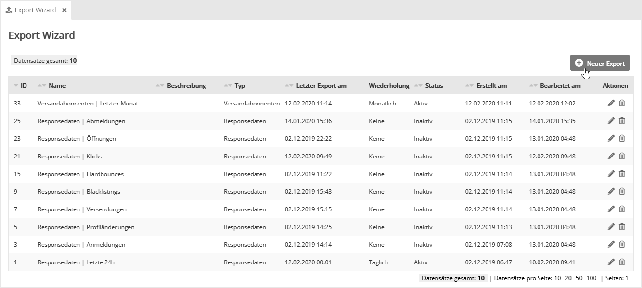 In der Übersicht können Sie mit Klick auf den Button 'Neuer Export' beliebig viele Exporte anlegen und nach Ihren Vorgaben definieren. Vorhandene Exporte lassen sich über die Symbole der 'Aktionen'-Spalte bearbeiten und löschena.