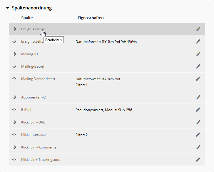 - Passen Sie die Spaltenreihenfolge per Drag&Drop an.